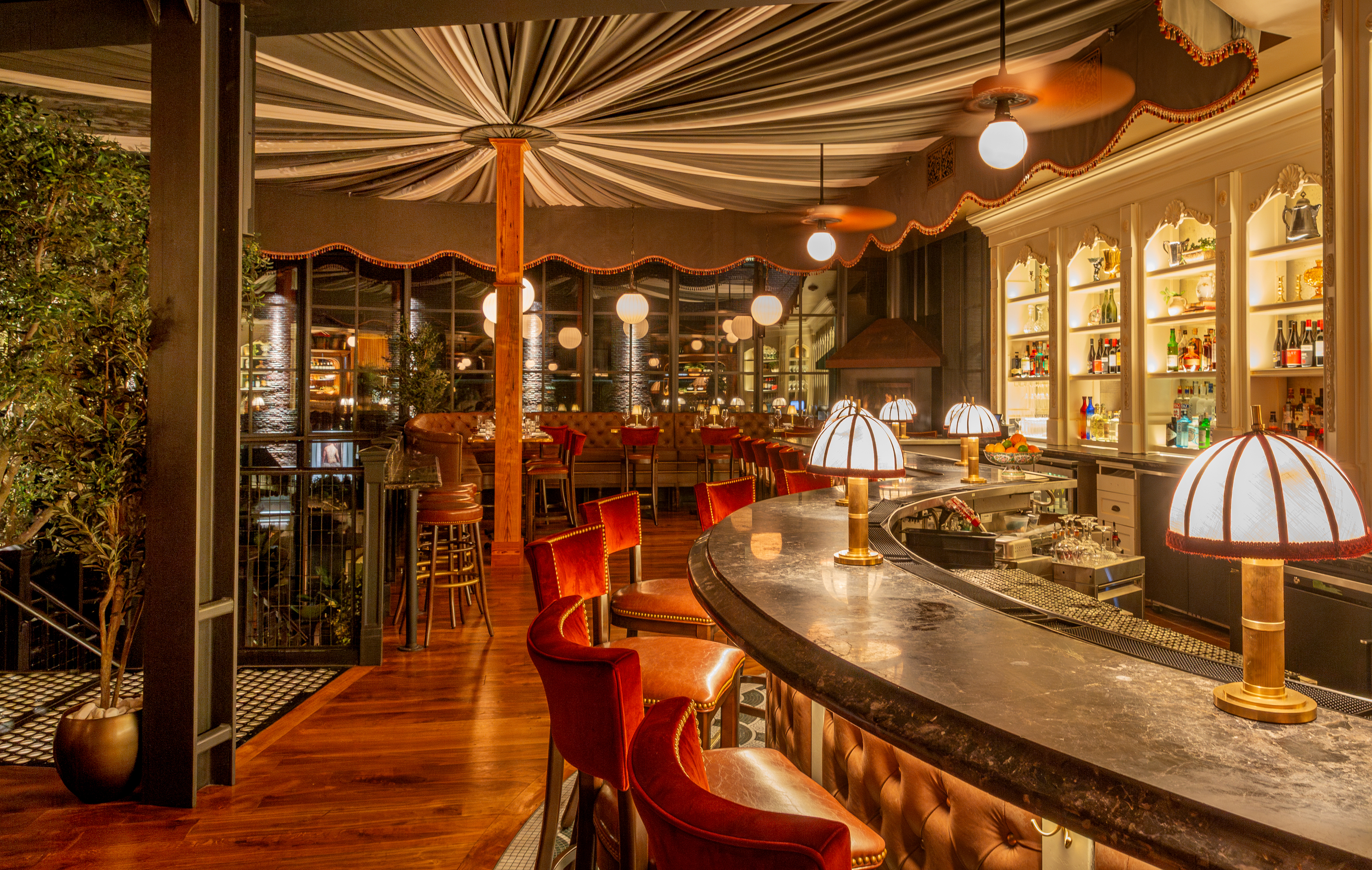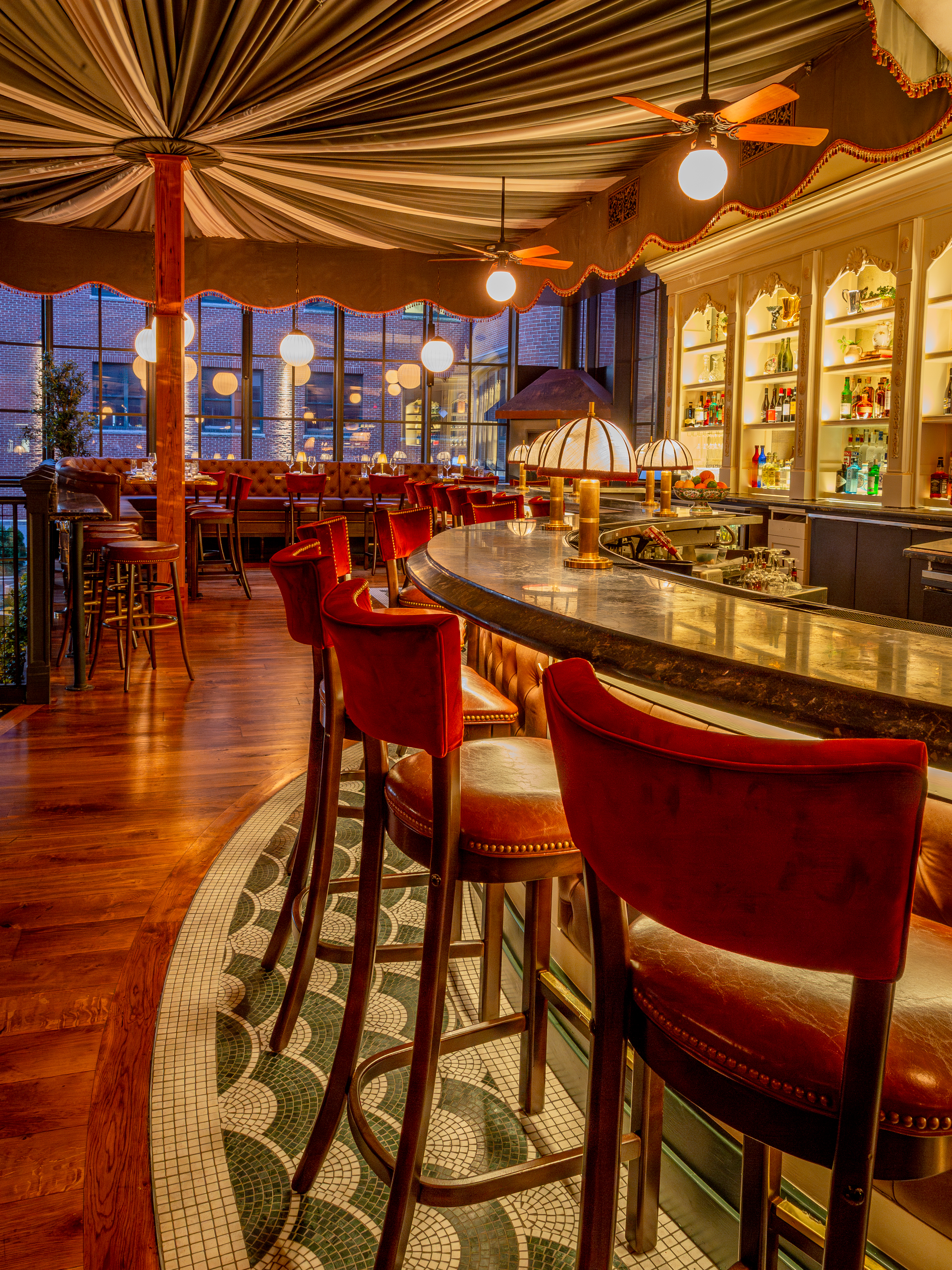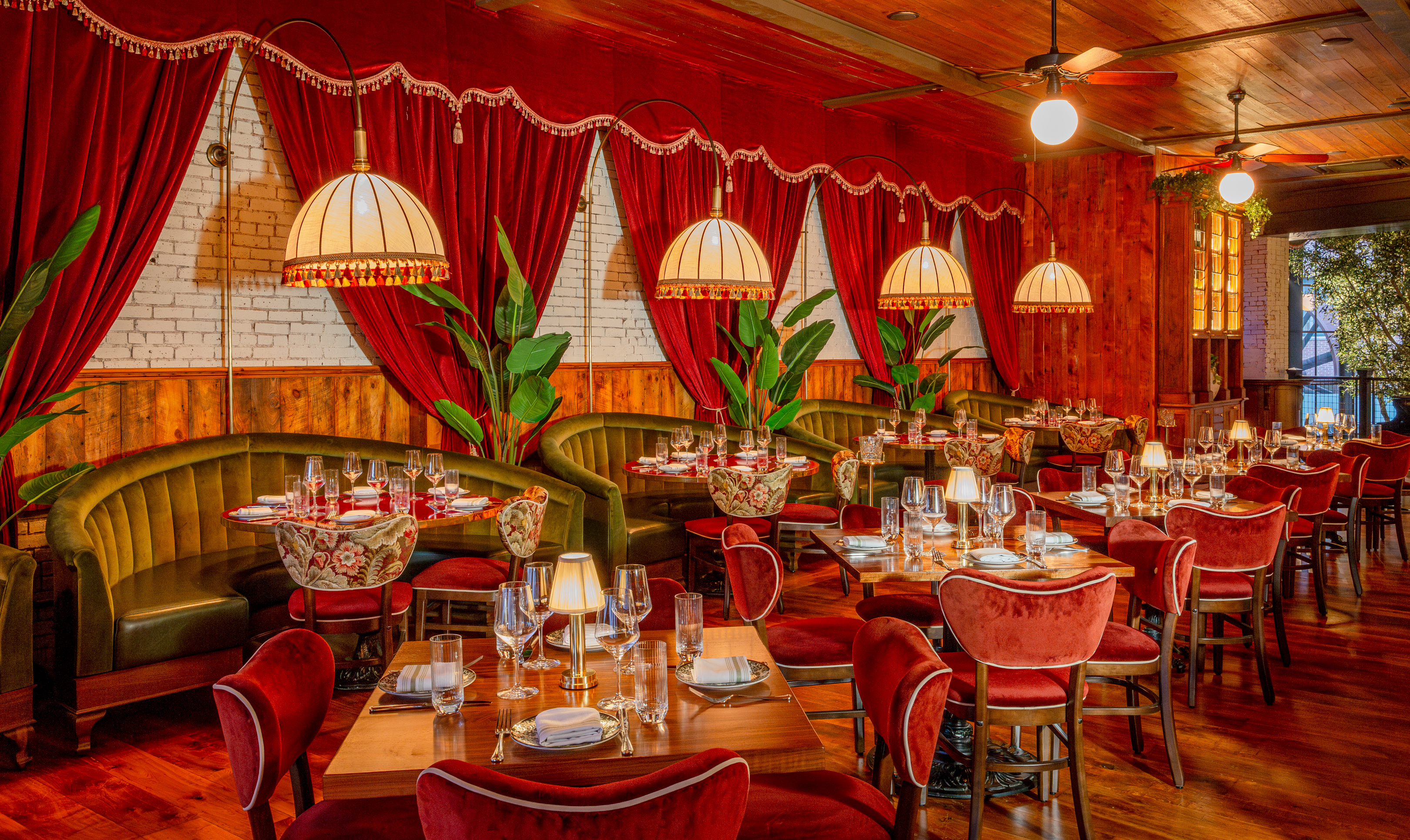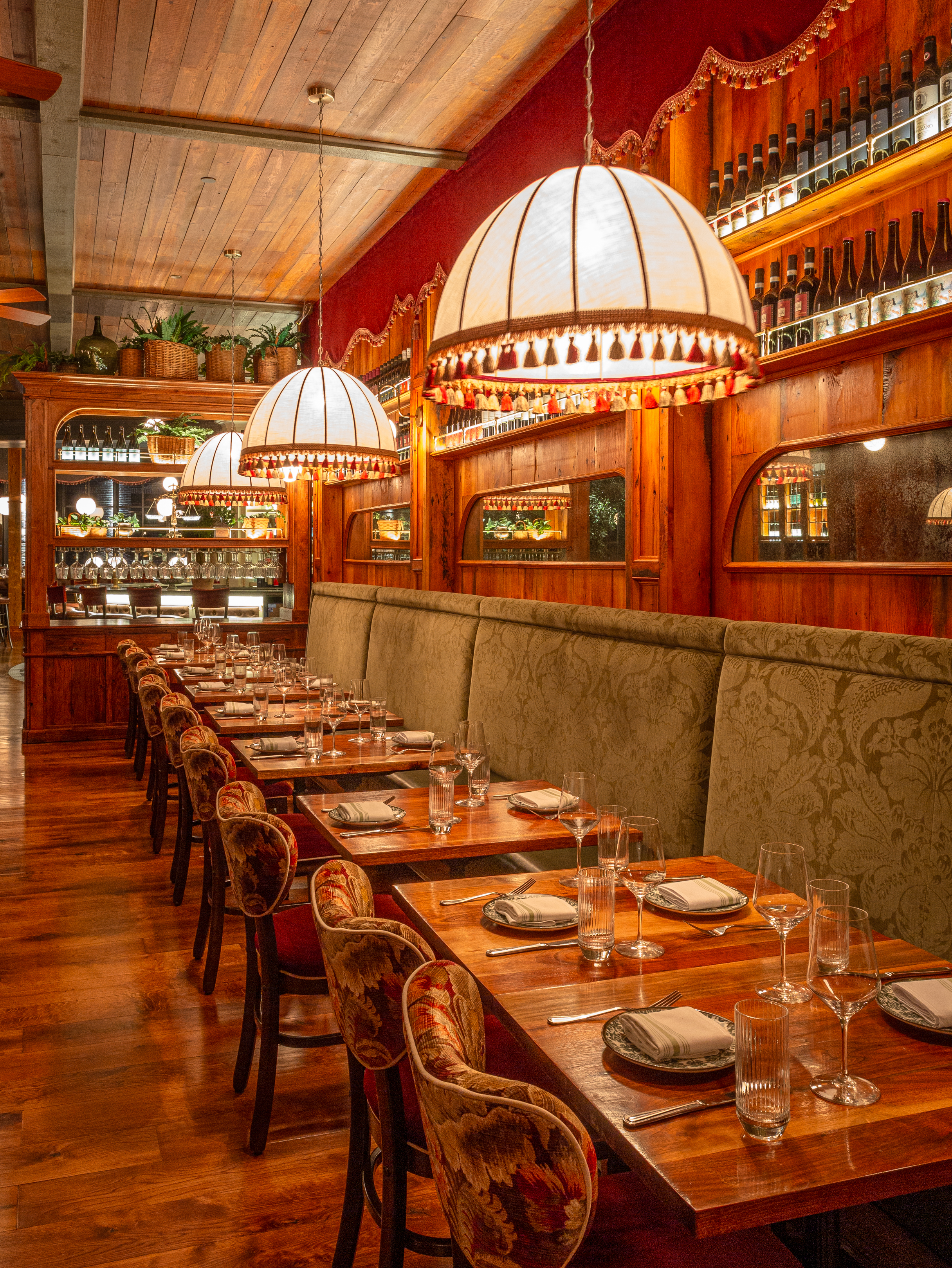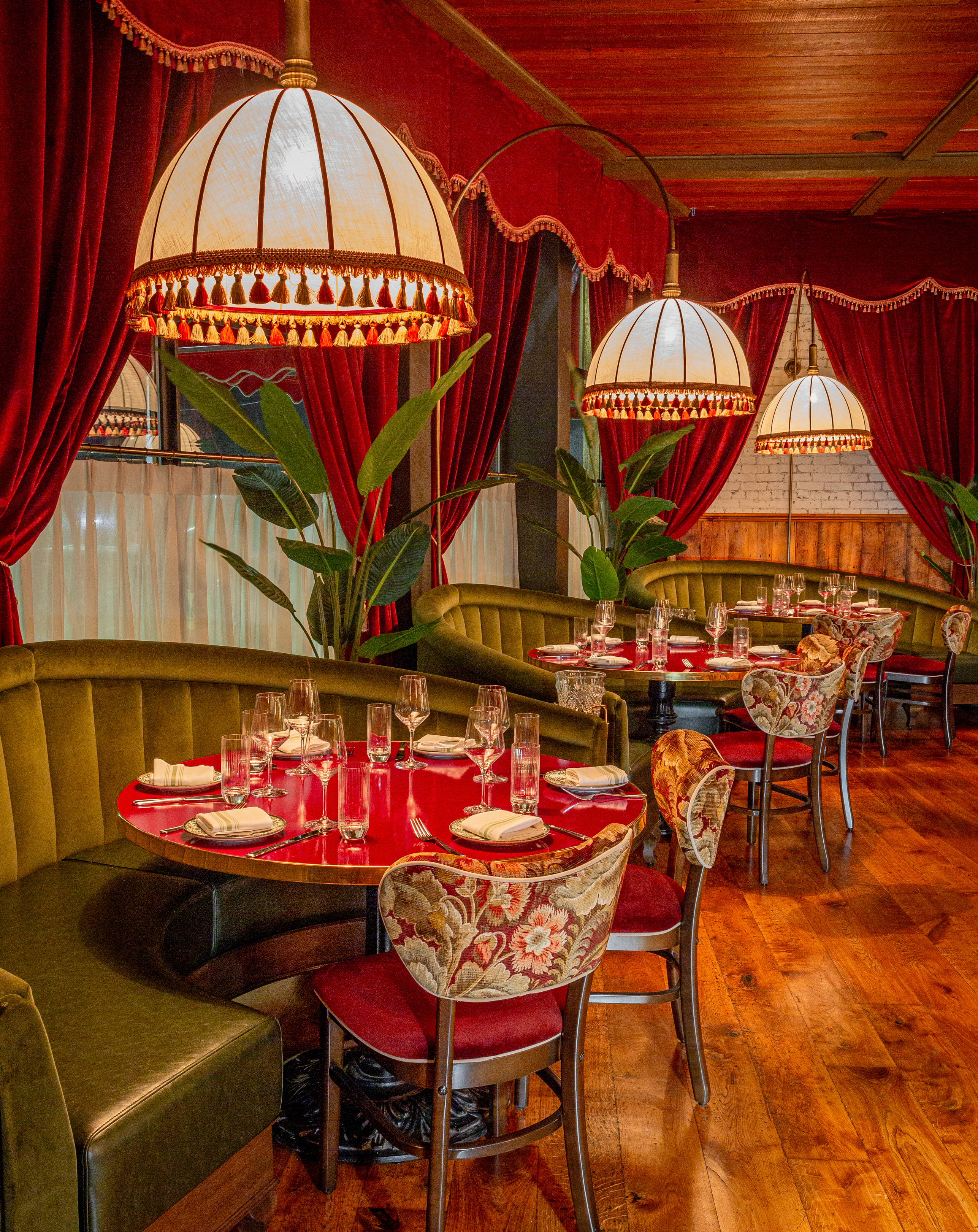 We’ve been very lucky to have a long standing working relationship with this amazing crew. And with each individual restaurant build out we do with them, we seek to create a space that has a unique personality and story to tell. At Capri, not only did we want to create a warm and welcoming atmosphere, but also a space where guests could have a variety of dining experiences under one big umbrella. Pun intended, of course. The space itselt is beautiful. It’s a stunning mix of rustic mill and modern industrial. We wanted the design to celebrate the older, more well-seasoned details in the room, while softening some of the more industrial ones. An infusion of warm woods, dramatic velvet curtains, and plush wraparound booths set the tone and hopefully compliment the original brick walls and wood beam ceiling.