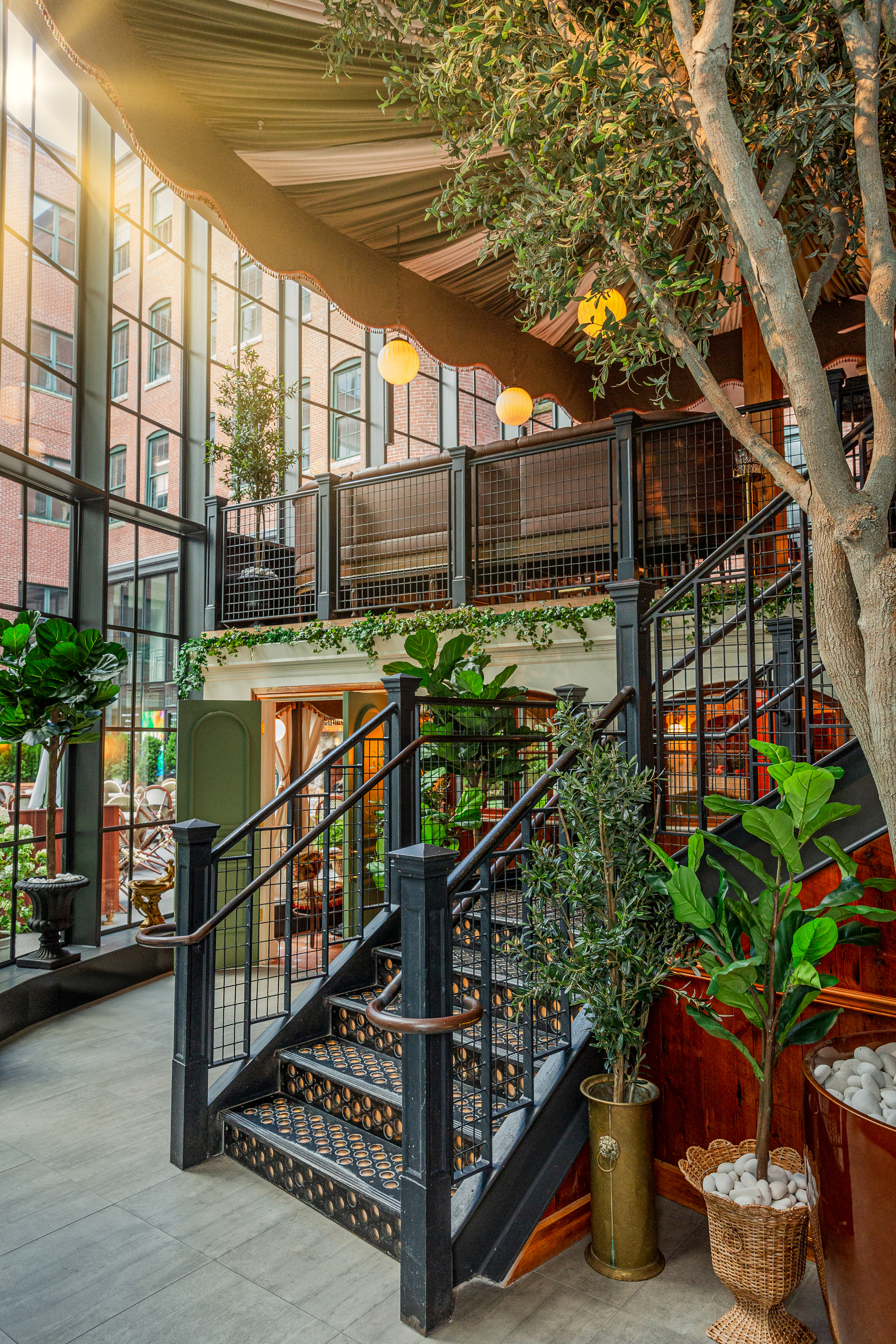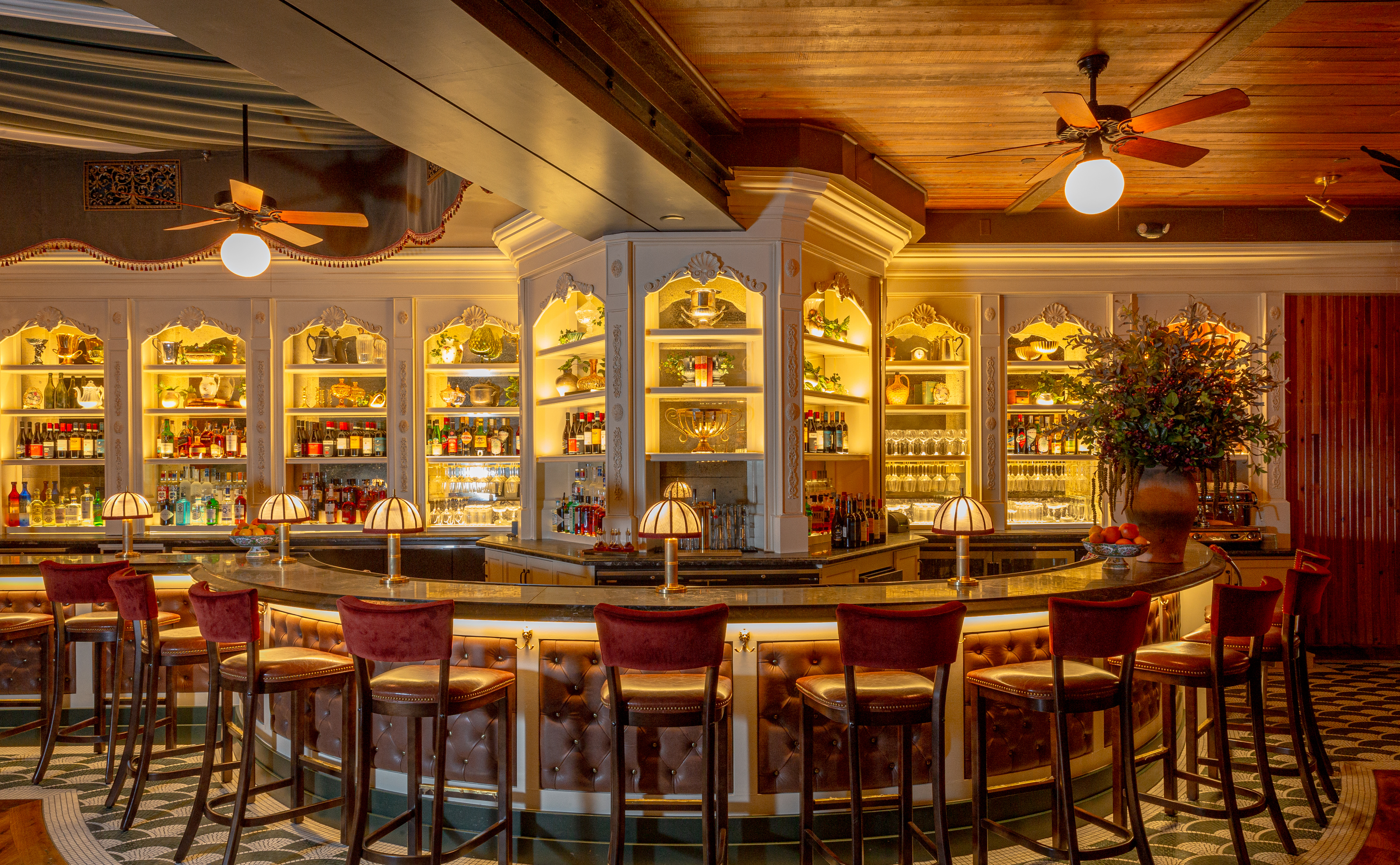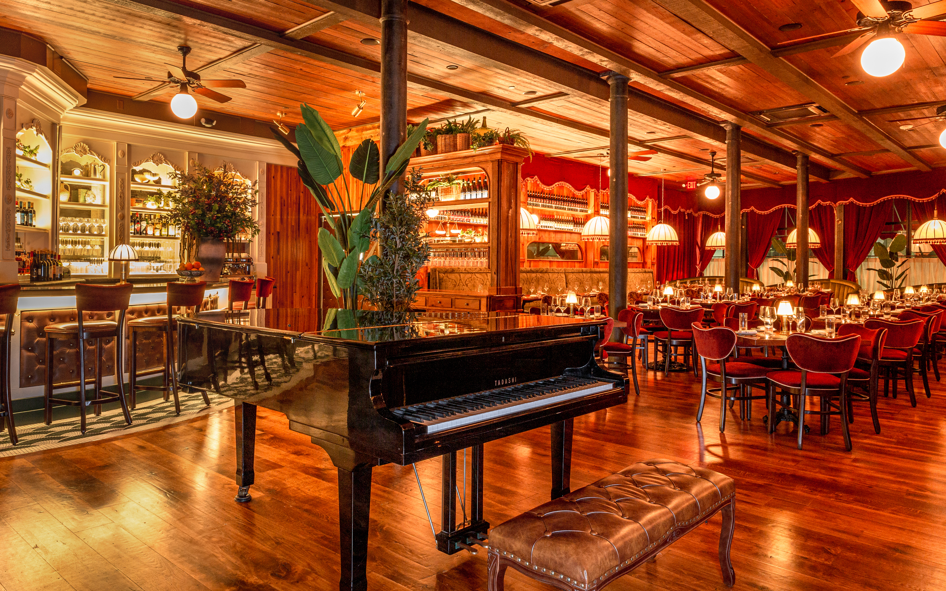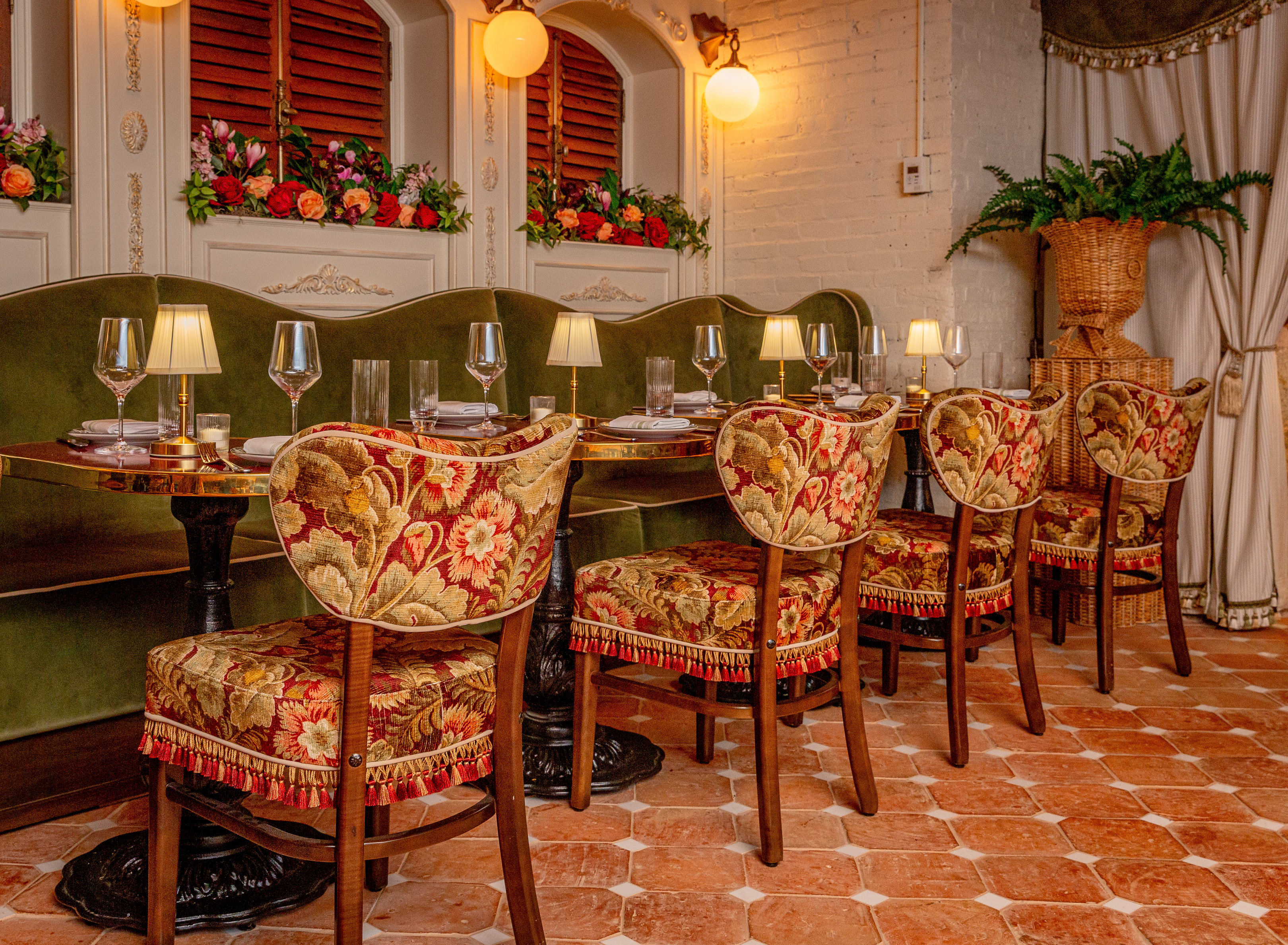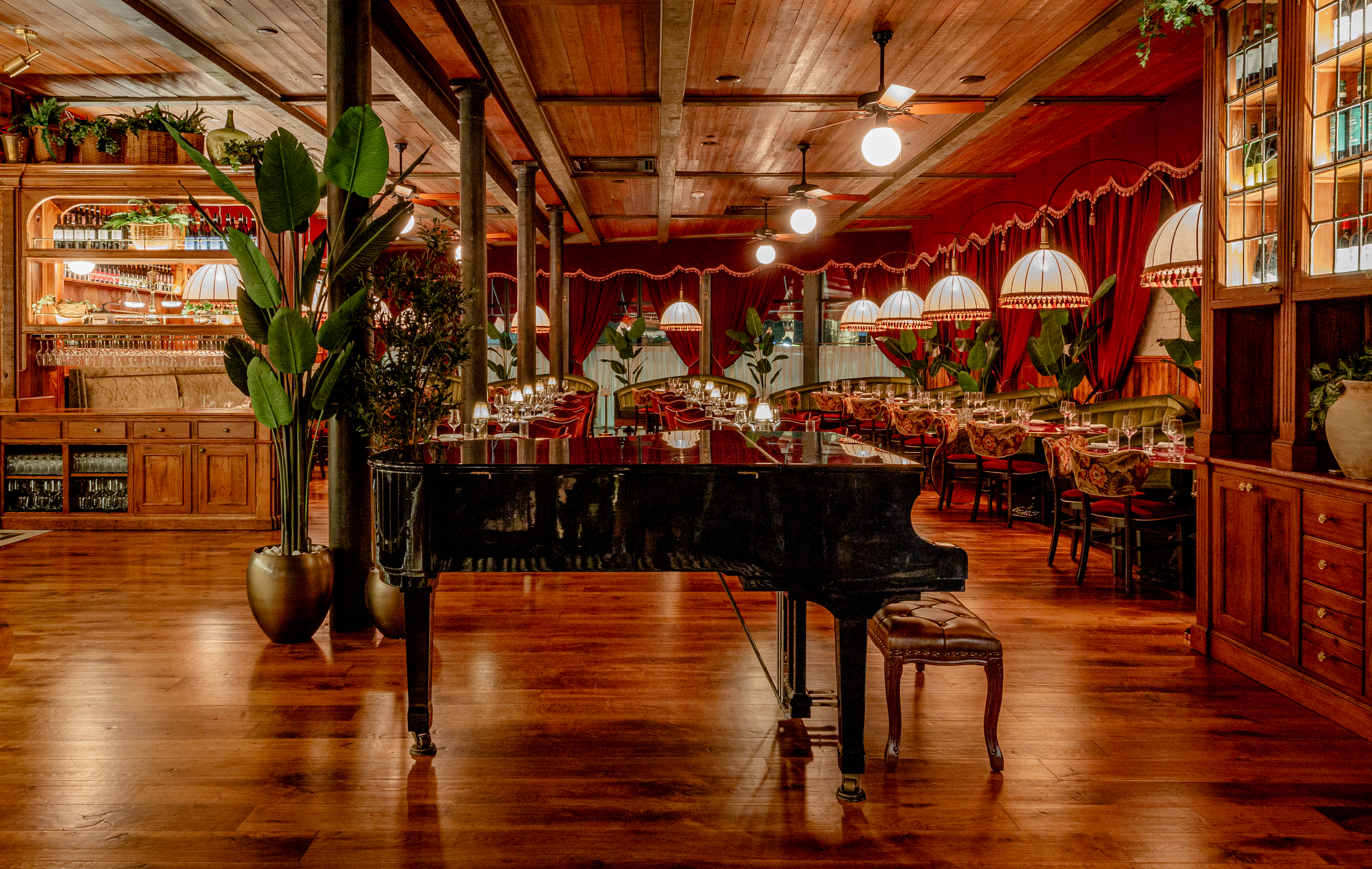 We’ve been very lucky to have a long standing working relationship with this amazing crew. And with each individual restaurant build out we do with them, we seek to create a space that has a unique personality and story to tell. At Capri, not only did we want to create a warm and welcoming atmosphere, but also a space where guests could have a variety of dining experiences under one big umbrella. Pun intended, of course. The space itselt is beautiful. It’s a stunning mix of rustic mill and modern industrial. We wanted the design to celebrate the older, more well-seasoned details in the room, while softening some of the more industrial ones. An infusion of warm woods, dramatic velvet curtains, and plush wraparound booths set the tone and hopefully compliment the original brick walls and wood beam ceiling.