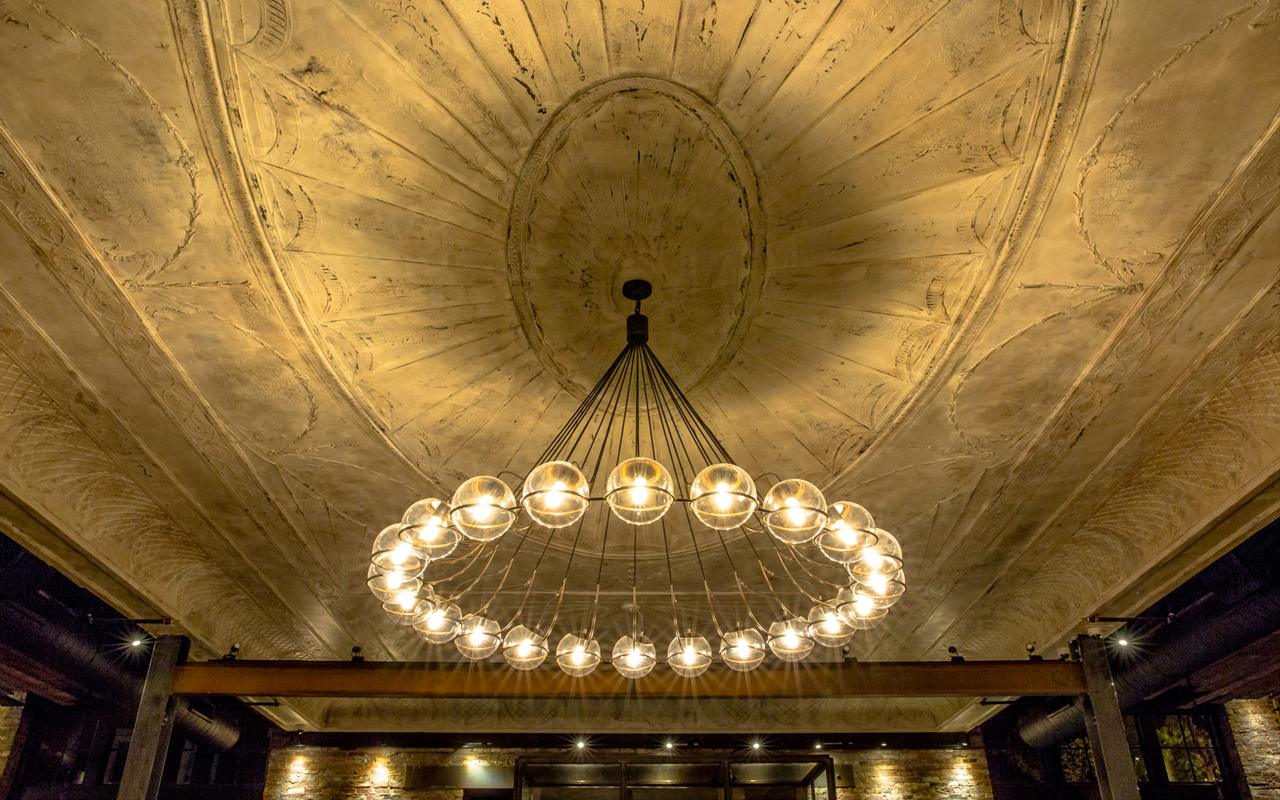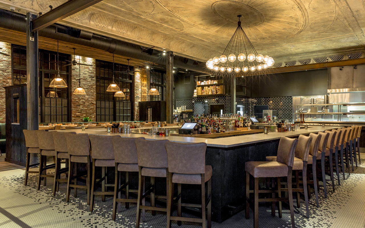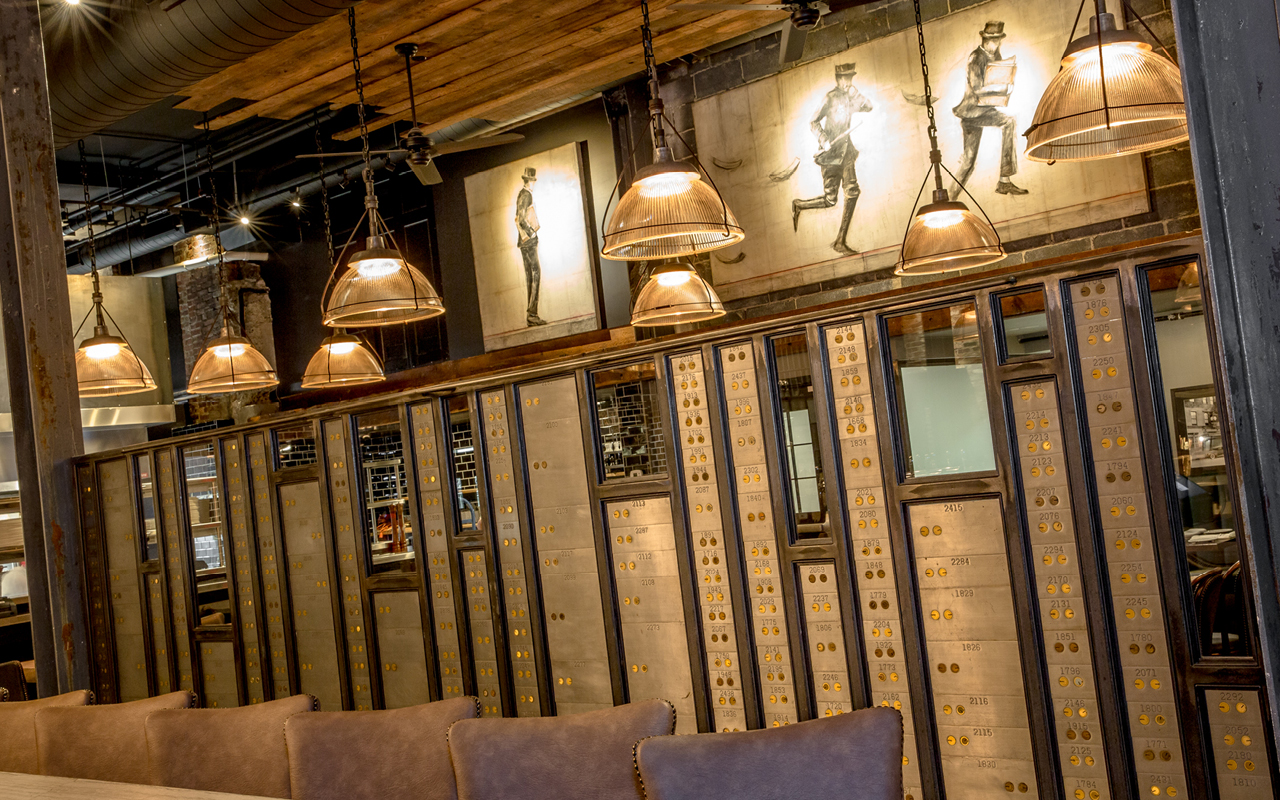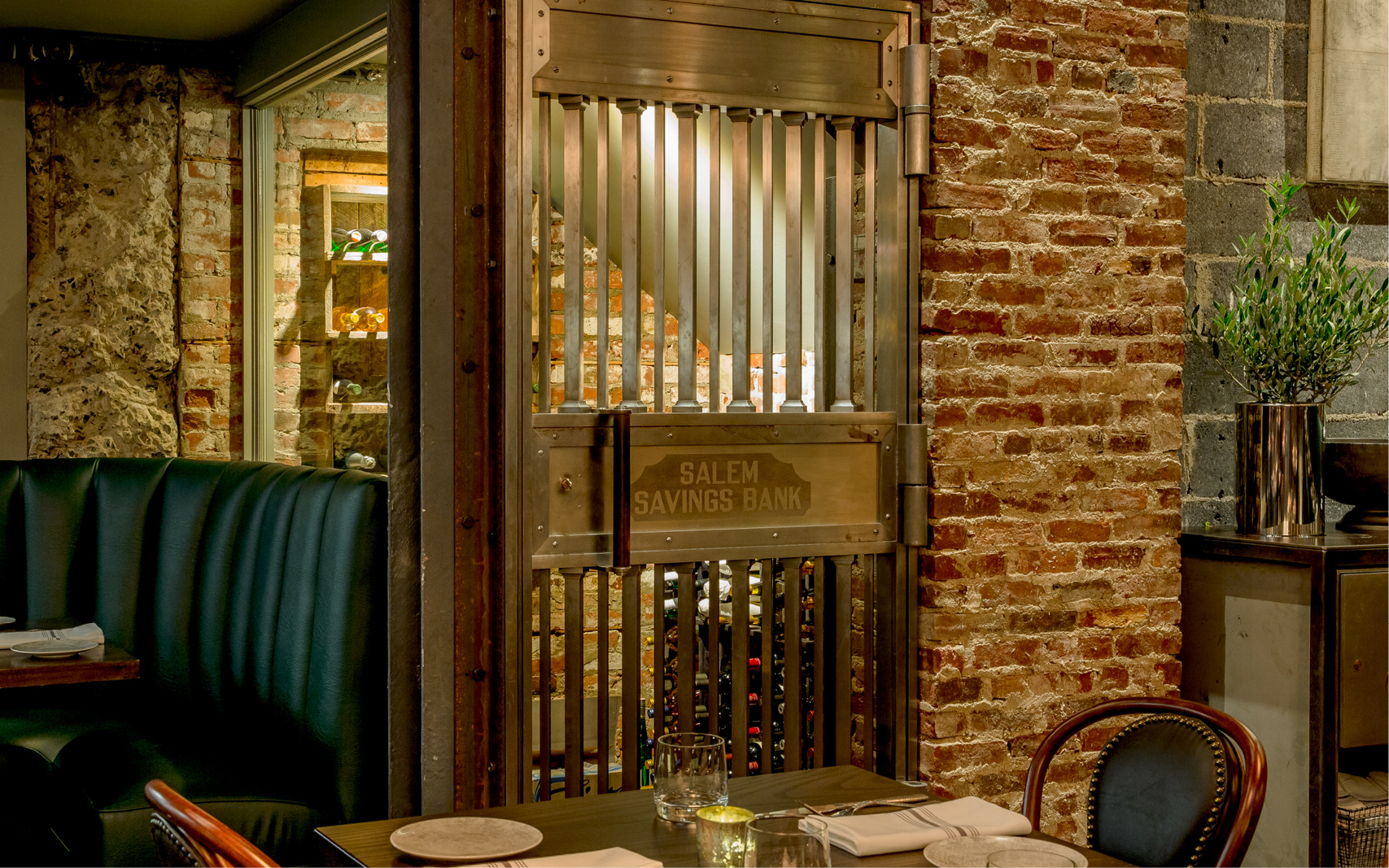 Ledger, located in the heart of historic Salem Massachusetts, continues to be one of our most beloved projects. This historic bank, circa 1818, was once home to the second oldest commercial bank in the United States. Dripping in history and packed with original details, our assignment was to create a comfortable, upscale dining experience that celebrates this unique past. Some design highlights include: a divider wall built from the safety deposit boxes pulled from the safe, custom 82″ chandelier highlighting the original plaster ceiling, 30′ communal reclaimed white oak table, and repurposed bank teller windows to name a few.