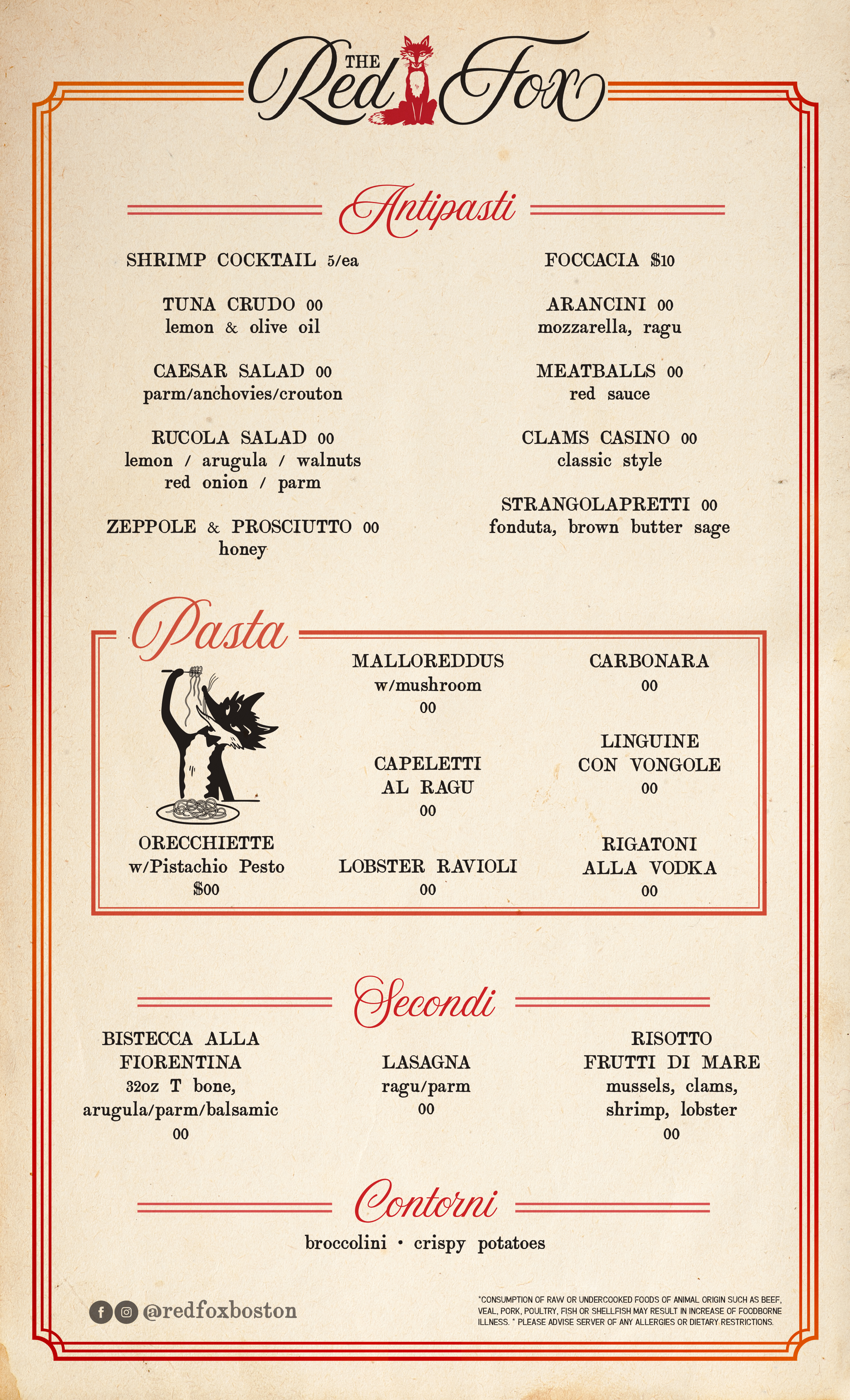 Boston’s North End is not only one of the country’s oldest neighborhoods (1603), it is one of the most historically significant places in a city chocked full of them. It’s the second oldest Italian neighborhood in the United States. It’s romantic, it’s lost in time, it’s hospitality driven, and it has at times been considered notorious. We were hired by the new generation of the North End. The young restaurateurs who are looking to make changes in this deeply traditional hood. They want to have fun, they want to pay tribute, and they want to remind the world that they have been making incredible food in this neighborhood for generations. The Red Fox looks to celebrate all of this… it’s a little traditional, a little forward thinking, and a whole bunch of notorious.